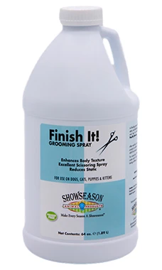 Showseason FinishIt is a light finishing spray that enhances body texture, reduces static and simplifies scissoring by adding a bit of moisture to cottony-fluffy coats which helps to add crispness to the hair. No lasting stiffness – just texture. Helps prevent coat matting and has no heavy build-up.